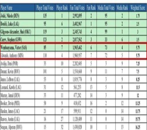 但细看的话,爱德华兹的球迷投票距离文班亚马其实只差了不到5000票而已,媒体投票更加接近,只差了1票——但凡爱德华兹多那么1张媒体投票,现在我们在讨论的“最大遗珠”就是文班亚马了。